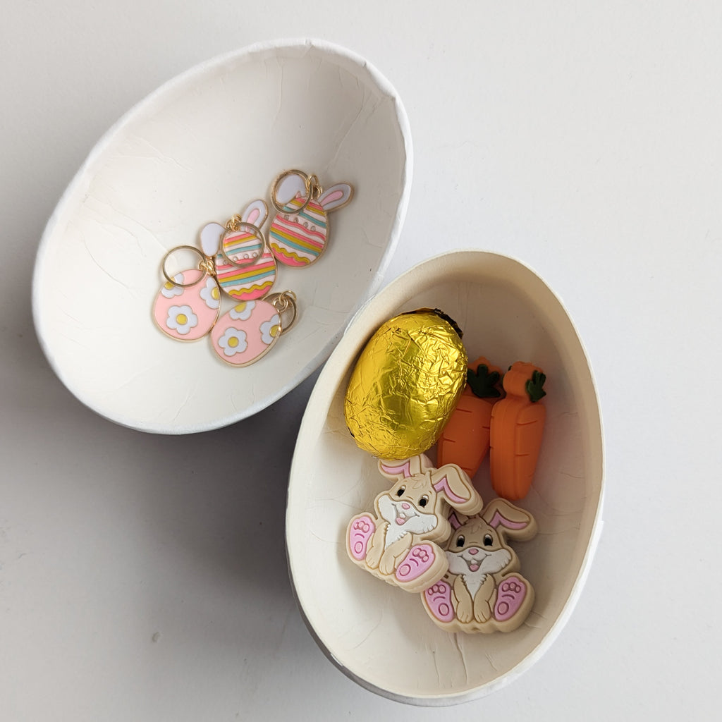 Litla páskaegg prjónarans er fallegt pappaegg sem inniheldur prjónastoppara og prjónamerki