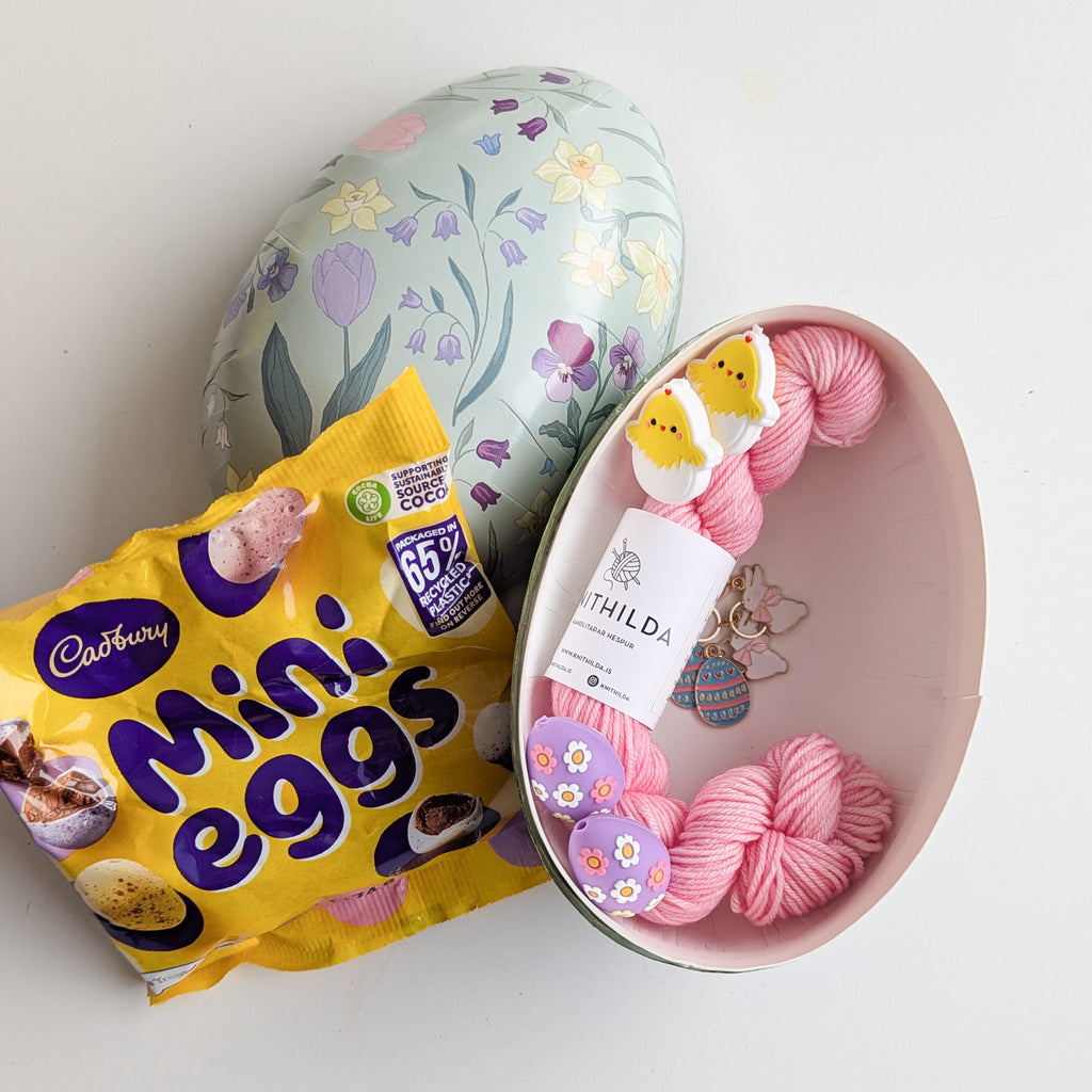 Miðlungs páskaegg prjónarans er fallegt pappaegg sem inniheldur garn, prjónastoppara og prjónamerki